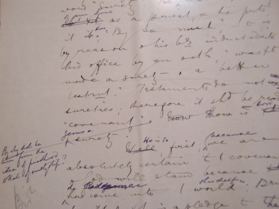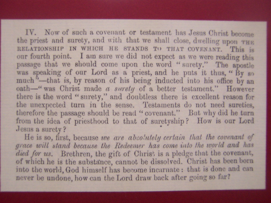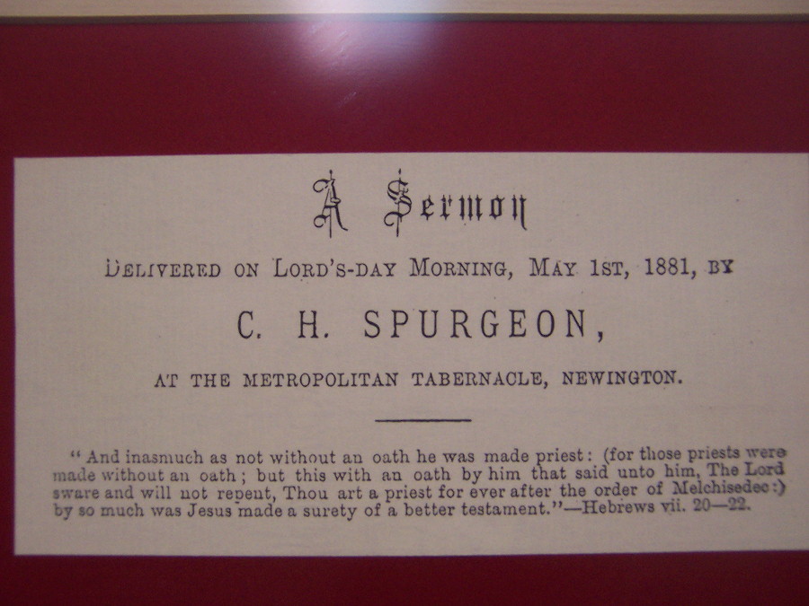 In 2005 I acquired a hand-written Spurgeon sermon note page. These were certified, sold, and commissioned by Spurgeon College in England. The page I own is page 32 from a sermon on Hebrews 7:20-22 preached at the Metropolitan Tabernacle on May 1st, 1881 (one hundred years to the month before I graduated from high school).